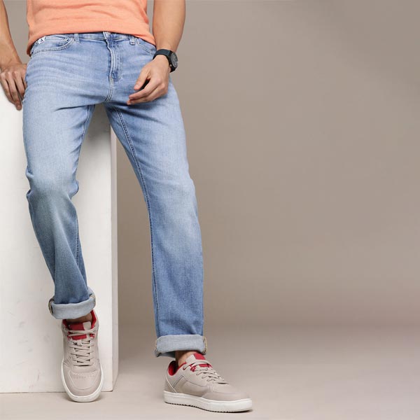- Medium shade, heavy fade blue jeans